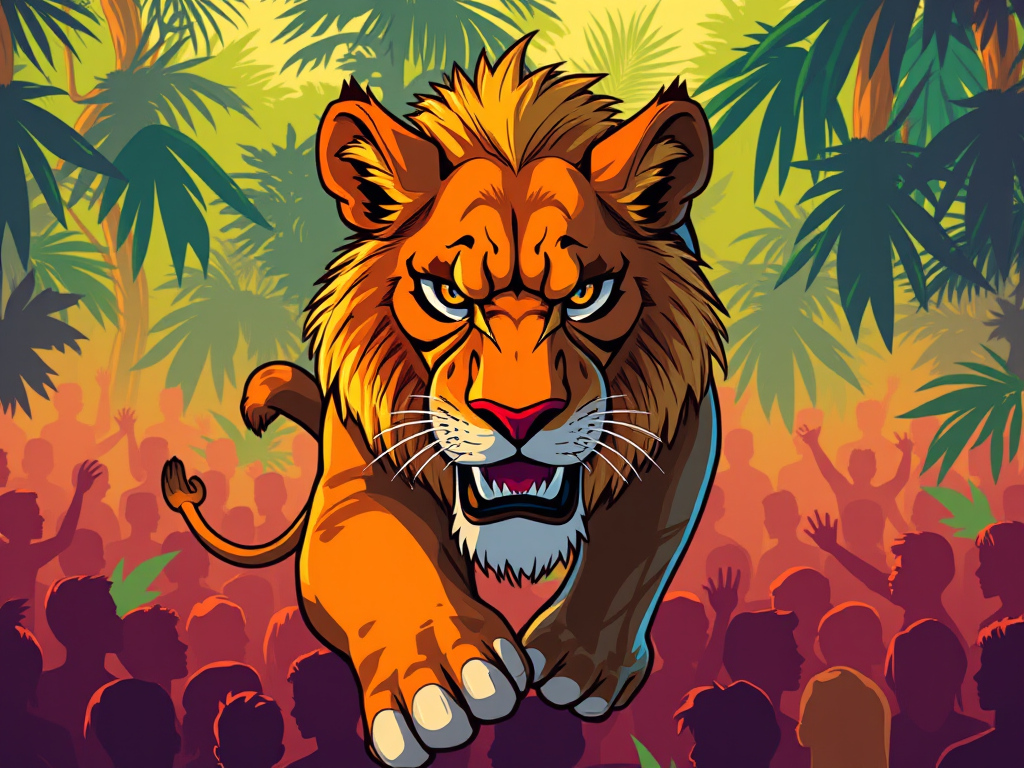 The feature Image read the title: Create a featured image depicting a fierce lioness in a vibrant, cartoon style, embodying strength and resilience. The lioness should be the central subject, portrayed with vivid colors and exaggerated features to emphasize its character. Include a lush jungle background filled with silhouettes of humans, representing a diverse crowd in a dynamic and vibrant setting, suggesting connection and community. The lighting should be bright and warm, evoking a sense of empowerment and action. Aim for a high-resolution, highly detailed image with sharp focus to capture the intricate details of both the lioness and the surrounding environment.