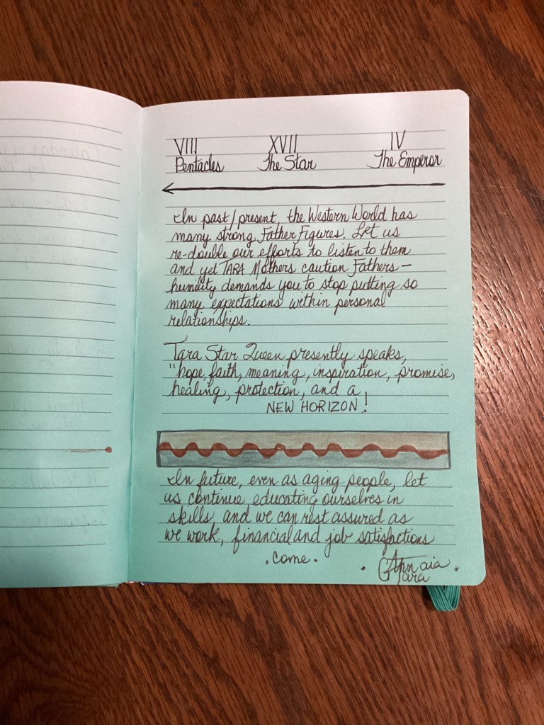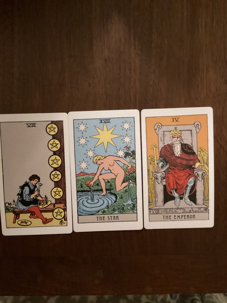 I drew IV EMPEROR; XVII THE STAR; and VIII PENTACLES tonight with this blog work.