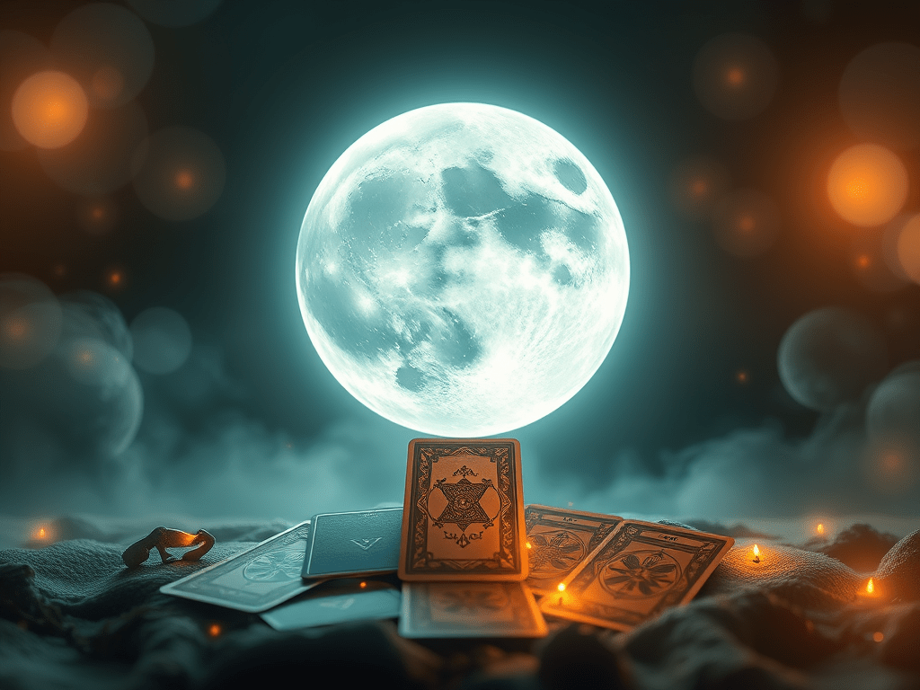 Feature Image AI : Create a highly detailed, sharp-focus image showcasing the concept of “Calendar of the Soul” by Rudolf Steiner. Center the image around a mystical full moon, illuminated in a radiant glow, symbolizing renewal and inspiration. Incorporate ethereal elements such as tarot cards (IV Emperor, XVII Star, VIII Pentacles) scattered gracefully beneath the moonlight. Use soft, warm lighting to evoke a sense of spirituality and hope, with subtle hints of nature to connect with the themes of healing and protection. Please ensure the image is high resolution to capture intricate details and textures.