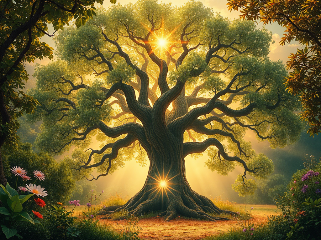Create a featured image that captures the essence of spiritual exploration and connection with nature, inspired by Rudolf Steiner’s “Calendar of the Soul.” The image should prominently feature a mystical oak tree as a symbol of wisdom and grounding, surrounded by vibrant botanical elements. Incorporate a soft, ethereal glow, reminiscent of dawn light, creating an inspiring and uplifting ambiance. The style should be a blend of realism and fantasy, emphasizing rich colors and intricate details. Ensure the final image is high resolution and highly detailed, with a sharp focus on the tree and surrounding foliage, evoking a sense of wonder and spiritual awakening.